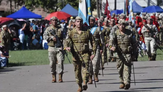 La banda militar Bonifacio Ruiz de los Llanos acompañó el desfile cívico militar iniciado por el Colegio Divina Misericordia, del que formaron parte academias, agrupaciones de fortines gauchos, cuerpos del Ejército, cadetes de la Policía de Salta, efectivos de Policía Federal y Servicio Penitenciario. Siendo el momento más emotivo el paso de los veteranos junto a familiares de caídos quienes portaron una gran bandera “honor y gloria a los veteranos de Malvinas Argentinas”.