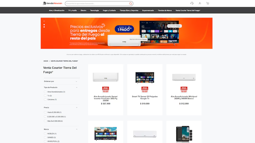 Pero rápidamente, con el correr de las horas, Newsan habilitó en su plataforma de e-commerce www.tiendanewsan.com.ar una solapa llamada “Venta courier Tierra del Fuego” en donde se ofrecen seis productos: tres modelos de aires acondicionados, 1 teléfono celular y dos televisores. Las marcas que por ahora se están comercializando de ese modo, con la rebaja de precios que implica, son Sansei, Noblex y Whirlpool. En este caso, a diferencia de Mirgor, la venta se realiza en pesos.
