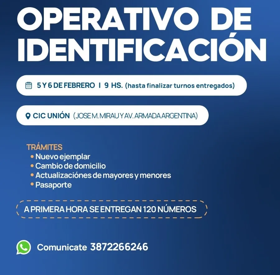 El jueves 5 y viernes 6 de febrero, el operativo de identificación se realizará en el CIC de zona norte. Se darán 120 turnos para la realización de nuevos ejemplares del DNI, cambio de domicilio y efectuar actualizaciones.
