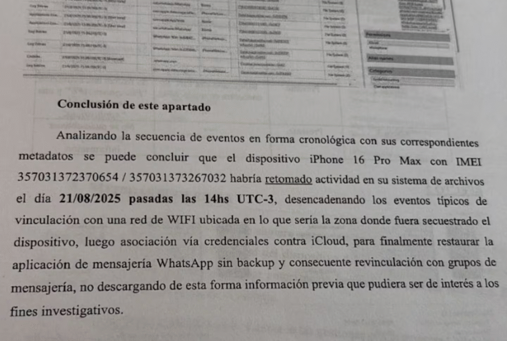 El documento, elaborado por la Dirección General de Investigaciones y Apoyo Tecnológico a la Investigación Penal (DATIP), dependiente del Ministerio Público Fiscal, detalla que el dispositivo iPhone 16 Pro Max entregado por Spagnuolo a las autoridades comenzó a registrar actividad en su sistema de archivos el 21 de agosto de 2025, pasadas las 14, es decir, menos de 24 horas antes del operativo judicial.