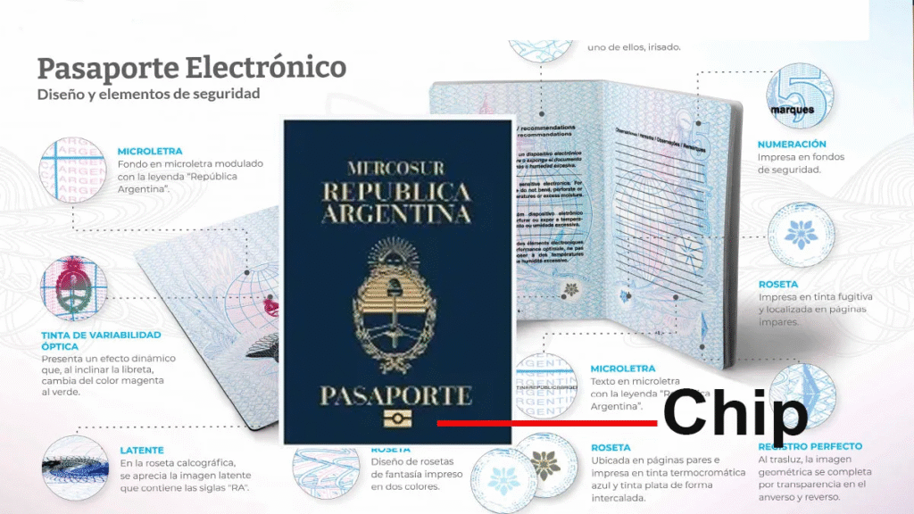 Un delegado gremial explicó a LPO que la conversación es sobre “un nuevo chip para el pasaporte, donde ubicarlo en la tapa y si se cruza con las líneas doradas de la impresión de la tapa del pasaporte”.