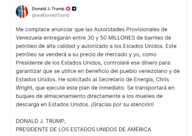 “Me complace anunciar que las Autoridades Provisionales de Venezuela entregarán entre 30 y 50 millones de barriles de petróleo de alta calidad y autorizado a los Estados Unidos”, contó Trump en Truth Social.