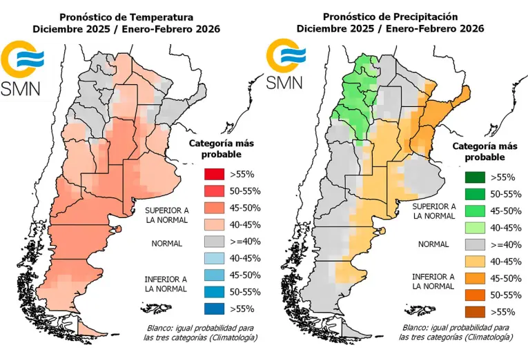El informe al que tuvo acceso Elonce se indica que “el pronóstico de consenso para diciembre-enero-febrero”, en cuanto a temperaturas estima mayor probabilidad de ocurrencia de temperaturas medias superiores a las normales en el centro y norte de Patagonia, La Pampa, oeste de Buenos Aires, Córdoba, este de San Luis y oeste de Santa Fe.