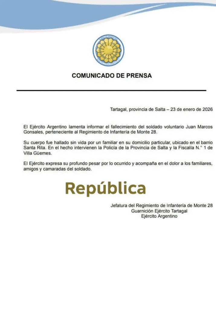 El Ejército Argentino informó el fallecimiento del soldado voluntario Juan Marcos Gonsales, integrante del Regimiento de Infantería de Monte 28, con asiento en Tartagal. El joven militar fue hallado sin vida en su domicilio del Barrio Santa Rita, hecho que generó profunda consternación en la comunidad y en la guarnición militar.