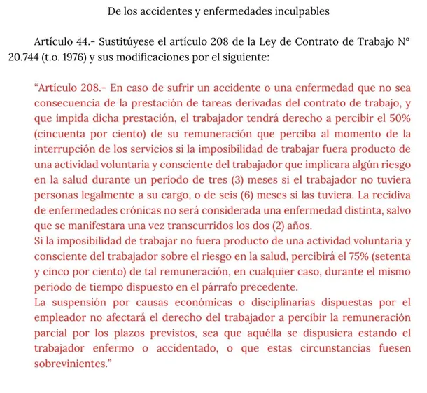 El foco de la polémica está en la modificación del artículo 208 de la Ley de Contrato de Trabajo (Art. 44 del proyecto). Hasta hoy, si un trabajador se enferma o tiene un accidente, cobra el 100% de su sueldo. Con la nueva ley, todo cambia.