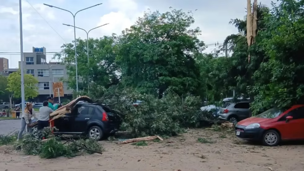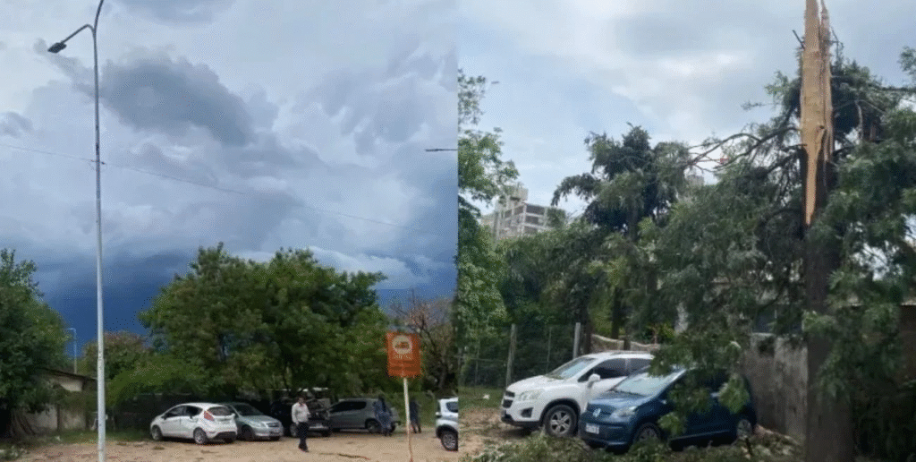El impacto del rayo no pasó desapercibido: el árbol alcanzado explotó por la fuerza del golpe y provocó destrozos en el entorno inmediato. A escasos metros se encuentra un estacionamiento del hospital, donde varios vehículos sufrieron daños por las ramas que fueron despedidas con violencia.