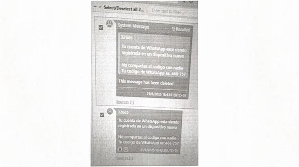 “Sin embargo -sigue el informe del organismo-, advirtieron rápidamente que la extracción evidenciaba el borrado de información previo a su entrega a la instrucción, así como también intentos de restablecimiento de la cuenta de WhatsApp en otro dispositivo, realizadas el 21 de agosto a las 15:43“.