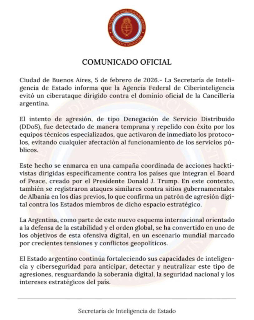 La Secretaría de Inteligencia de Estado (SIDE) aseguró a través de un comunicado publicado en su flamante cuenta en la red social X que logró evitar un ciberataque dirigido contra el dominio oficial de la Cancillería argentina.