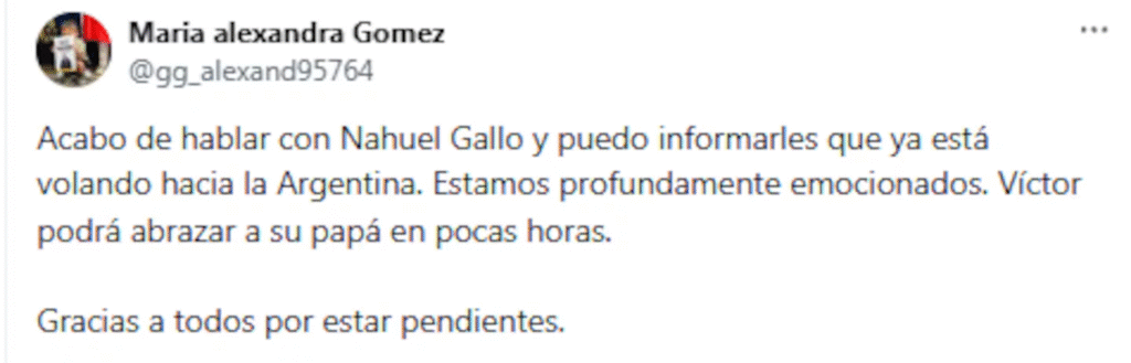 La pareja de Gallo, la venezolana María Alexandra Gómez aseguró que estaban “profundamente emocionados” por el regreso del gendarme al país. “Víctor podrá abrazar a su papá en pocas horas. Gracias a todos por estar pendientes”, escribió en un posteo en X.