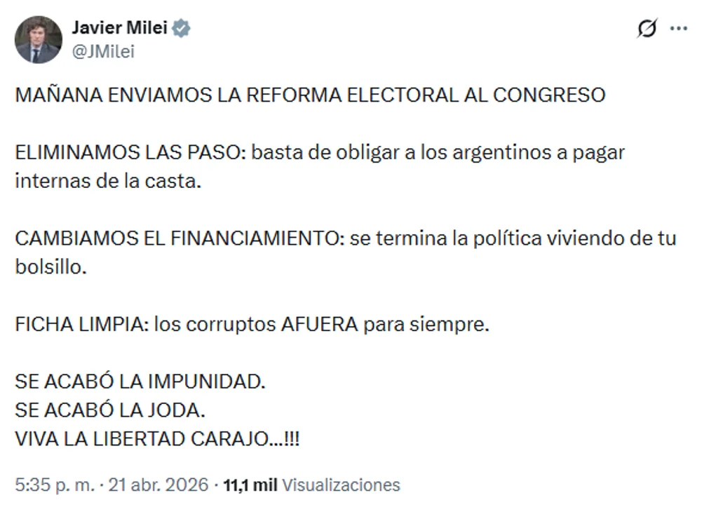 El presidente Javier Milei anunció que el Gobierno enviará este miércoles al Congreso, un proyecto de reforma electoral que incluye la eliminación de las PASO, cambios en el financiamiento de la política y la implementación de Ficha Limpia para impedir candidaturas de personas con condenas por corrupción.