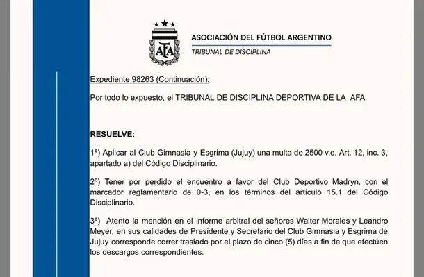 En su descargo, Gimnasia de Jujuy había solicitado que el encuentro se reanudara en el estadio “23 de Agosto”, a puertas cerradas y haciéndose cargo de los costos de traslado y estadía del equipo rival. Sin embargo, el Tribunal desestimó ese pedido y ratificó la sanción en favor de Deportivo Madryn.