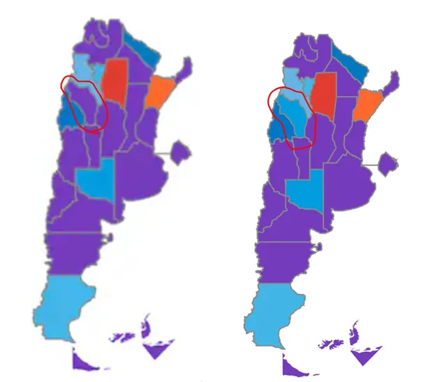 Resulta que el domingo, el Gobierno mostró los resultados parciales cuando el conteo lo tenía como gran ganador. Entonces, esa provincia se había “pintado” de violeta, y así quedó incluso hasta el lunes, ya que se había detenido la carga de datos.
