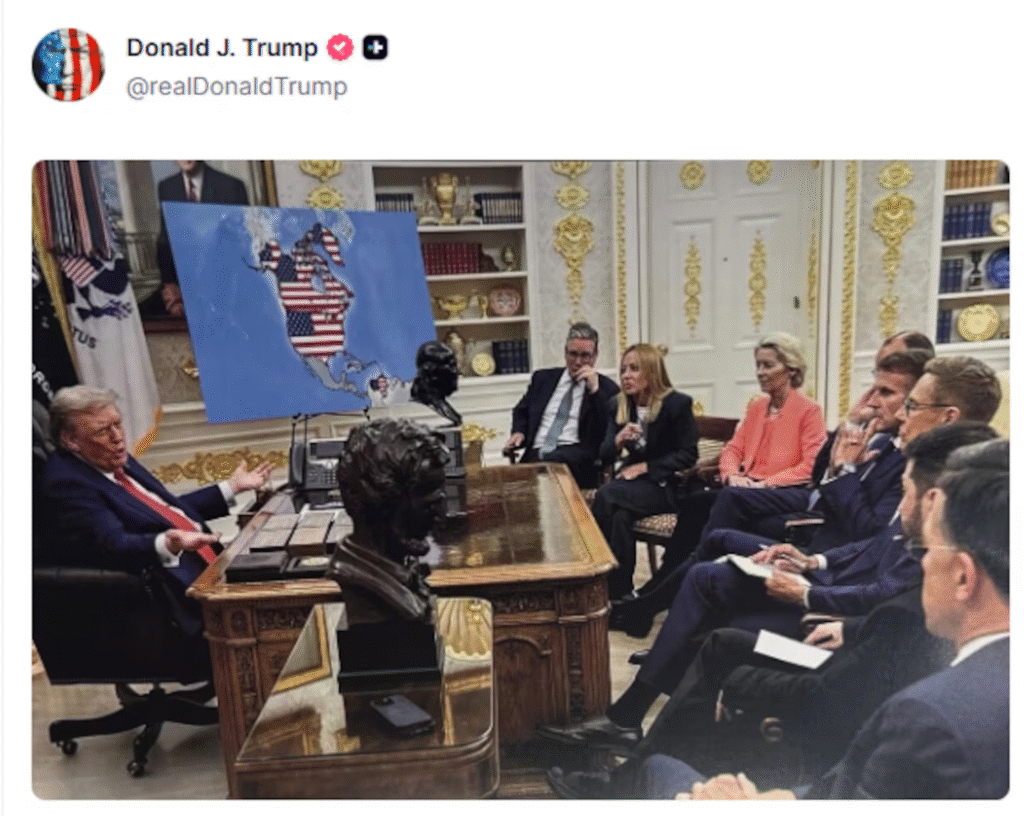 El último avance incluyó una imagen creada con IA que muestra a Trump conquistando Groenlandia este año y que publicó en su cuenta de la red Truth Social. No fue su única bravuconada del día. También divulgó un mapa que cubre con la bandera estadounidense a Estados Unidos, Canadá, Groenlandia y Venezuela, a la que atacó el 3 de enero en una acción que incluyó la captura de Nicolás Maduro.