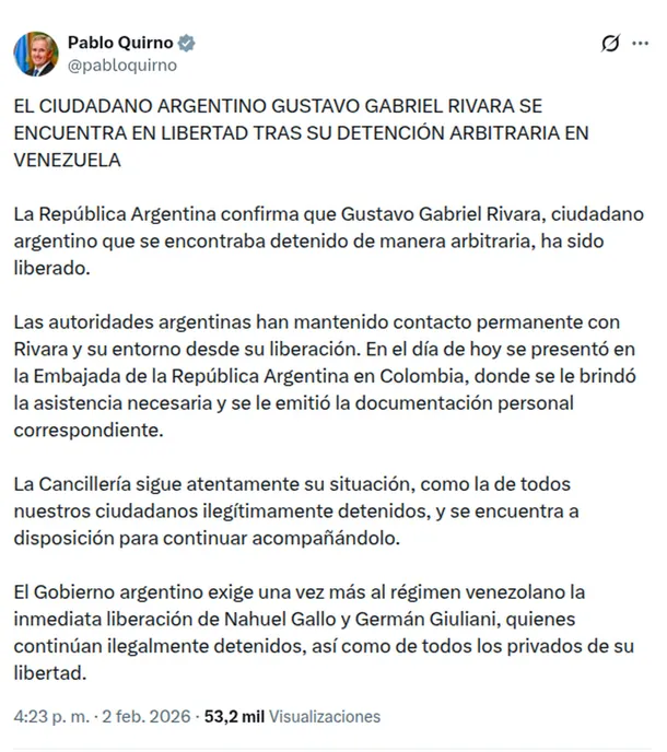 La República Argentina confirma que Gustavo Gabriel Rivara, ciudadano argentino que se encontraba detenido de manera arbitraria, ha sido liberado. Las autoridades argentinas han mantenido contacto permanente con Rivara y su entorno desde su liberación“, informó Pablo Quirno.