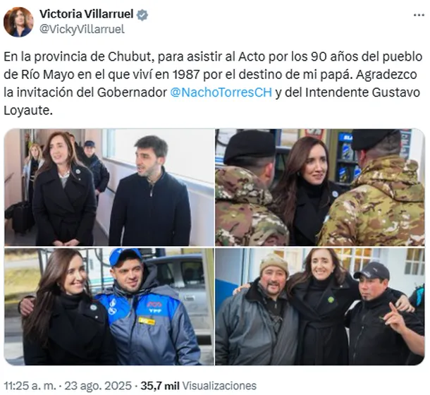 La mismísima vicepresidenta compartió en sus redes sociales el motivo de su paso por la provincia de Chubut: “En la provincia de Chubut, para asistir al Acto por los 90 años del pueblo de Río Mayo en el que viví en 1987 por el destino de mi papá. Agradezco la invitación del Gobernador @NachoTorresCH y del Intendente Gustavo Loyaute”.
