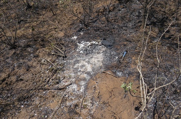En el marco de esa labor, y a modo indiciario, el can efectuó una marcación positiva en el sector donde se halló el primer grupo de evidencias —integrado por el teléfono celular, cuchillos y restos en análisis—, todos presumiblemente incinerados, así como en otro punto próximo de la misma zona.