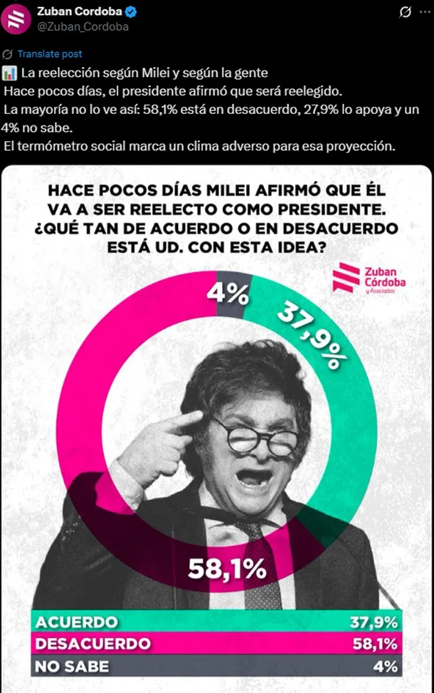 De acuerdo con los datos del estudio, el 58,1% de los encuestados está en desacuerdo con la posibilidad de una reelección de Milei, mientras que apenas el 27,9% se muestra a favor y un 4% se mantiene indeciso. Estos porcentajes reflejan una tendencia preocupante para el oficialismo, que enfrenta un creciente nivel de rechazo social.