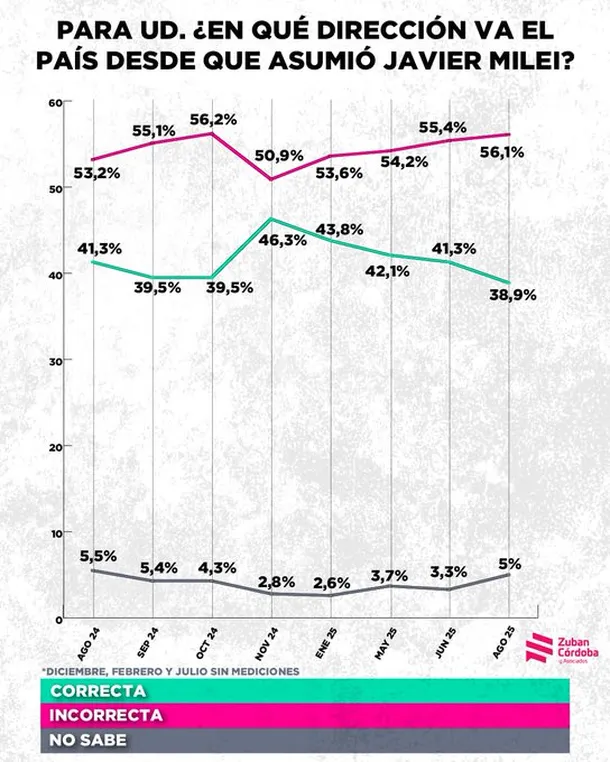 Un relevamiento realizado en agosto por la consultora de opinión pública y comunicación política Zuban-Córdoba reveló un dato significativo en el escenario político actual: casi el 60% de los argentinos considera que el presidente Javier Milei no logrará ser reelecto en 2027, en contraposición con las afirmaciones del propio mandatario, quien días atrás expresó su intención de ir por un segundo mandato durante una entrevista en el canal de streaming Neura.